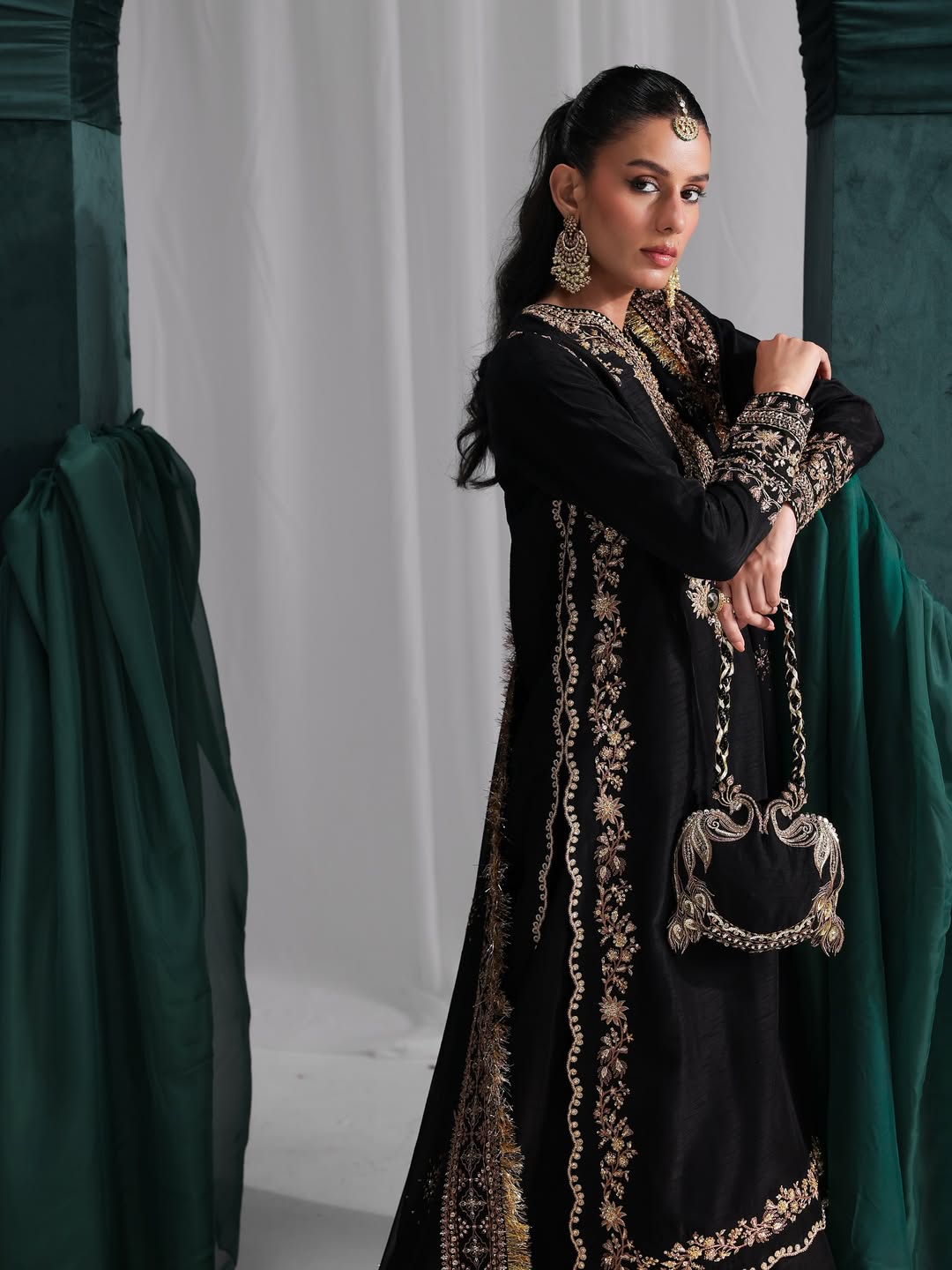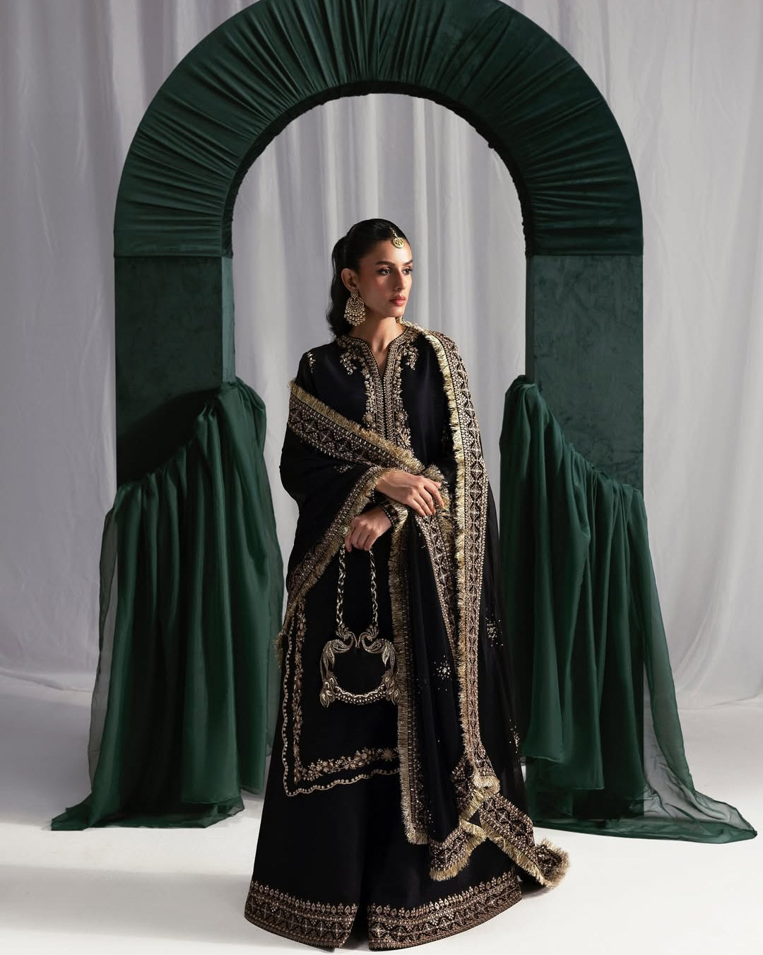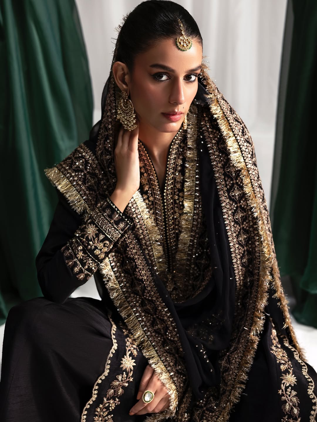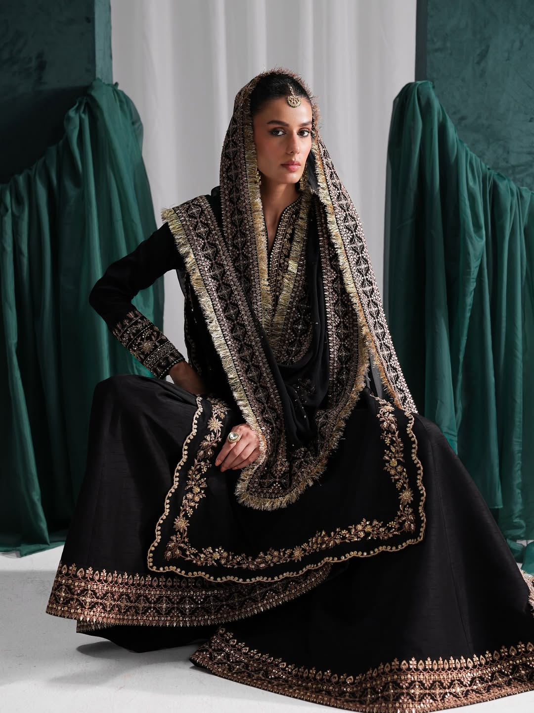 The outstanding Black Luxury features a long raw silk shirt adorned with intricate embroidered motifs across the shirt and sleeves. Each motif is delicately embellished with sequins, naqshi creating a luxurious and radiant appeal. The same exquisite sequinned embroidery is carried onto the sharara and along the borders of the dupatta, ensuring a cohesive and opulent look. Perfect for weddings, festive occasions, and grand celebrations, this ensemble embodies timeless elegance and masterful craftsmanship.